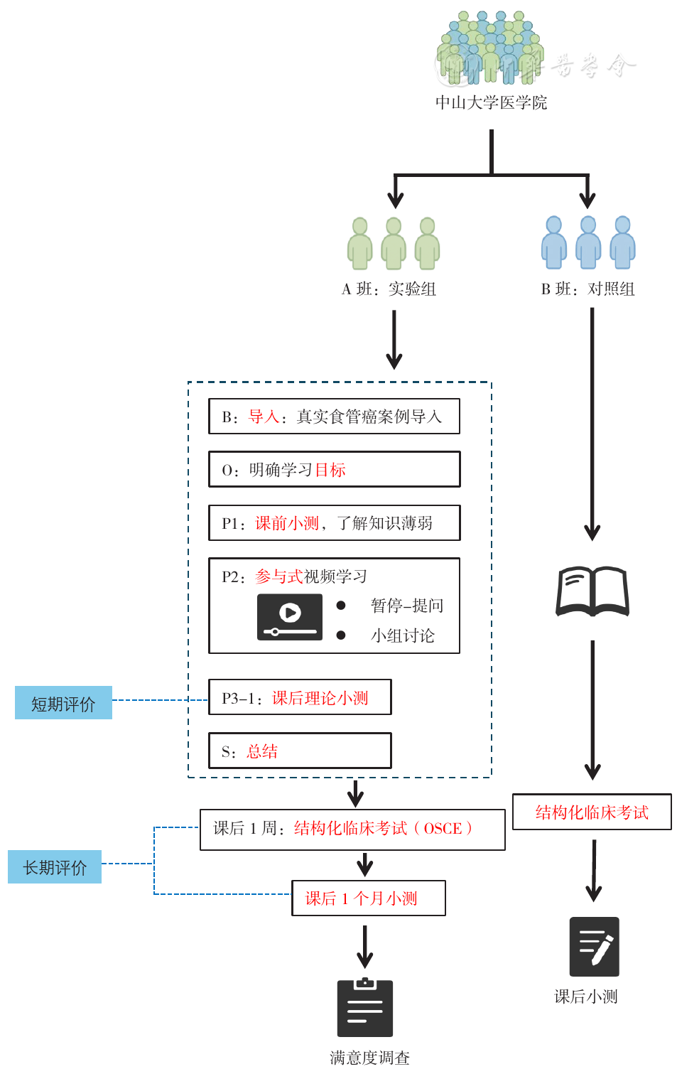 以中山大学医学院临床医学专业2个平行班级的学生为研究对象,将其分为实验组与对照组。采用单盲设计,所有参与研究的学生均不知晓自身被分入实验组或对照组。两组均开展以"食管癌根治术中淋巴结清扫"以及"内镜下黏膜剥离术(ESD)"为核心知识点的食管癌微创外科专题教学,对照组采用传统教学模式,通过展示解剖图谱结合理论讲解完成教学;实验组在多媒体手术视频教学基础上联合BOPPPS教学模式,将课程设计为课前-课中-课后阶段,通过课前小测等内容了解学生在食管癌TNM分期、相关治疗以及淋巴结清扫相关方面知识的薄弱点,课程中额外引入食管癌根治术中淋巴结清扫环节以及ESD多媒体手术视频,以动态演示手术操作流程、解剖结构识别及关键操作要点辅助教学。课程结束后,实验组和对照组统一通过课后测试、1周后的客观结构化临床测试(OSCE)以及1月后的再次课后测试考察评估学生食管癌TNM分期、相关治疗以及淋巴结清扫相关方面知识掌握程度,同时以匿名问卷调查收集教学满意度反馈。